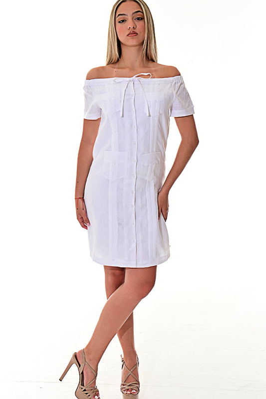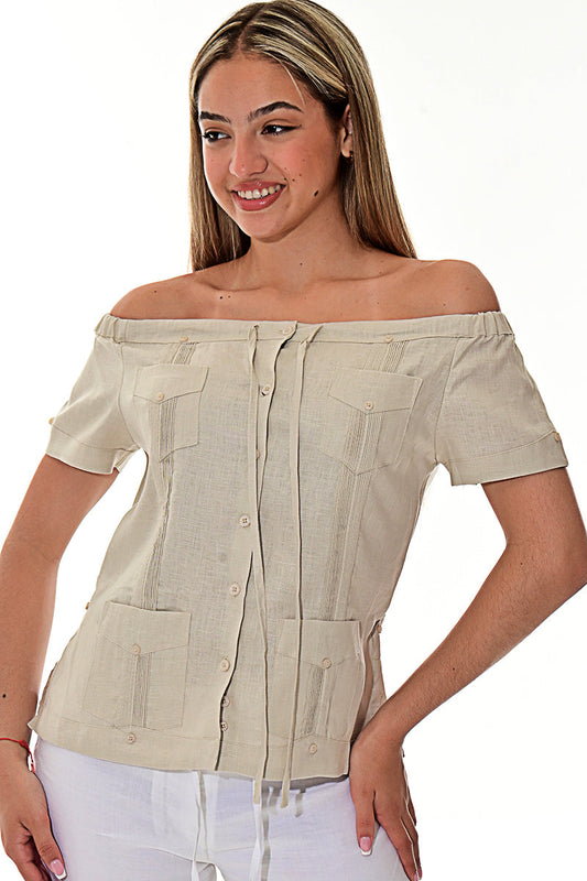 Ladies Linen Guayabera Off-the-Shoulder Short Sleeve Top in (5) Colors - LLGB3007