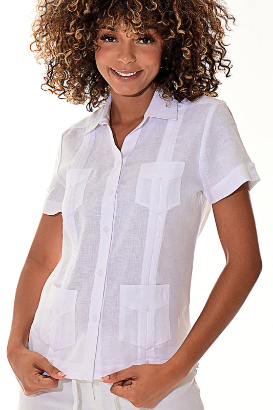 Ladies 100% Soft Linen Traditional (4) Pocket Short Sleeve Guayabera Blouse in (5) Colors - LLGB3008