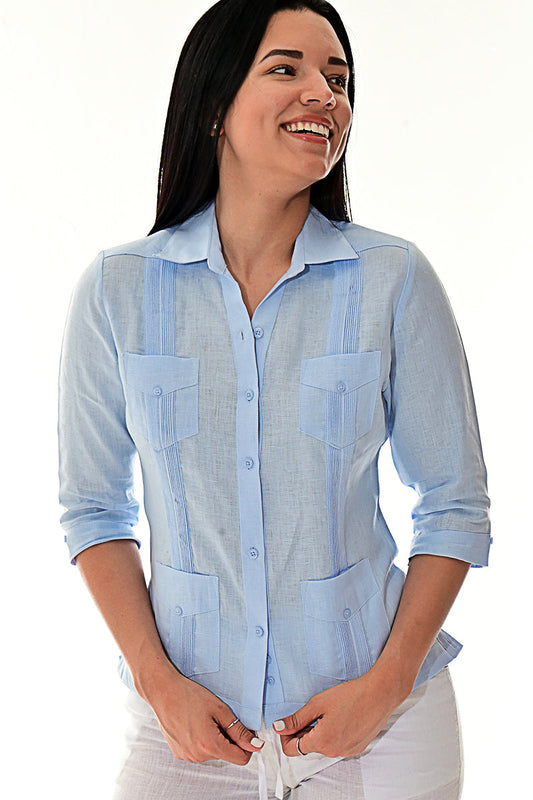 Ladies 100% Soft Linen Traditional (4) Pocket 3/4 Sleeve Guayabera Blouse in (5) Colors - LLGB3009